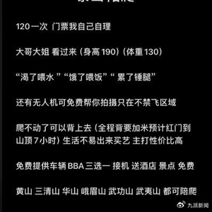 我们陪爬的报价按陪爬的人头计算,人均价格在100到500元,这是纯陪爬的价格,门票我们办理了年卡,不需要对方掏钱,但中途如果要坐索道或大巴,需要对方报销。不同价位的区别主要在于顾客能否爬完全程,还有些客户想看日出,这个花费也高一点。爬山过程中我们还会拍些视频放自媒体账号上,有些人想有一个良好的爬山体验,觉得拍视频会耽误爬山,这种我们也会针对性定价。
