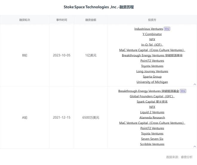 2021年2月,Stoke Space完成种子轮910万美元融资,由NFX和MaC Ventures领投,YC、Liquid2、Reddit创始人Alexis Ohanian的SevenSevenSix、运动明星Joe Montana等跟投。