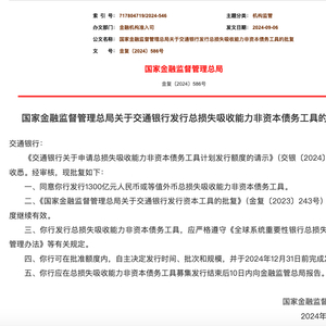 文件显示,金融监管总局于9月6日同意交通银行发行1300亿元人民币或等值外币的总损失吸收能力非资本债务工具,《国家金融监督管理总局关于交通银行发行资本工具的批复》(金复〔2023〕243号)所剩余额度继续有效。