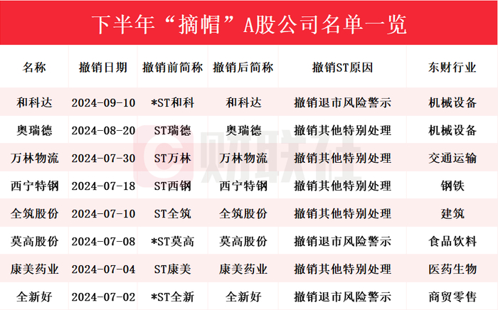 财联社9月15日讯 风险警示因素消除,多家A股上市公司“脱星摘帽”。据Choice数据统计,下半年已有8家ST公司成功“摘帽”,具体A股名单主要为和科达、奥瑞德、万林物流、西宁特钢、全筑股份、莫高股份、康美药业和全新好。具体情况如下图:
