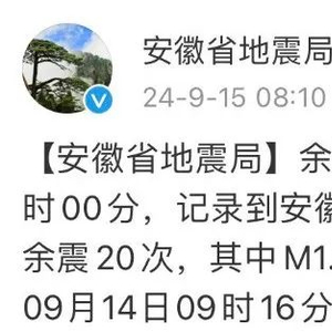 9月15日上午,安徽省地震局发布余震信息:截止至09月15日08时00分,记录到安徽肥东M3.9级地震M0.0级以上余震20次,其中M1.0级以上余震6次,最大余震为09月14日09时16分M1.5级地震。