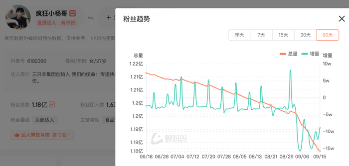 9月15日,据第三方平台蝉妈妈数据显示,抖音带货主播小杨哥(张庆杨)粉丝量近90日自1.21亿跌至1.18亿,三只羊网络粉丝量自1165.3万跌至1142.1万。