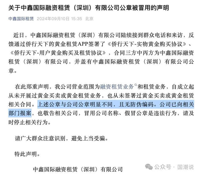 不过,中鑫国际很快发布声明撇清与侨行天下的合作关系,公司自成立起从未开展过黄金买卖或黄金租赁业务,侨行天下与投资者签署的黄金购买协议公章与公司公章明显不同,且无防伪编码。公司已向相关部门报案。
