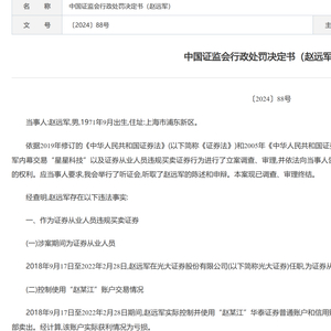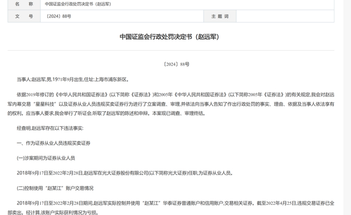 中国证监会行政处罚书显示,赵远军,男,1971年9月出生,住址为上海市浦东新区。2018年9月17日至2022年2月28日,赵远军在光大证券任职,为证券从业人员。