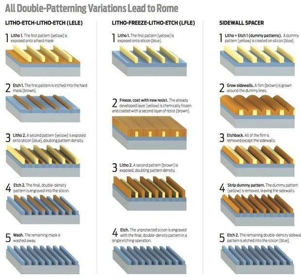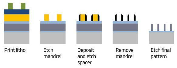 原来一层光刻图形被拆分到两个或多个掩膜上,实现了图像密度的叠加。