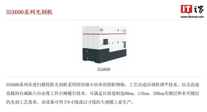 而在此之前,技术最先进的国产光刻机应为上海微电子的 SSX600 系列 90nm 光刻机。
