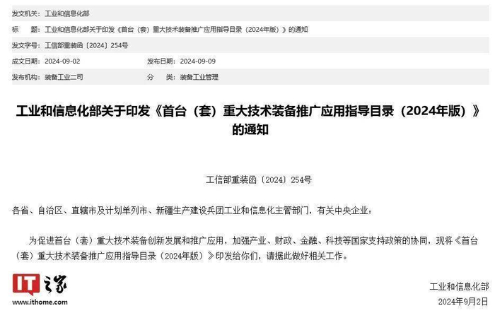 工业和信息化部 9 月 9 日印发《首台(套)重大技术装备推广应用指导目录(2024 年版)》通知,文件列表包含国产氟化氪光刻机(110nm),和氟化氩光刻机(65nm)的相关内容。