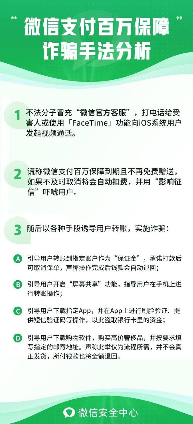 同时,平台也在微信支付百万保障相关页面设置了反诈提醒,用户可以通过【客户端-我-服务-钱包-消费者保护-安全保障-百万保障】了解更多信息。