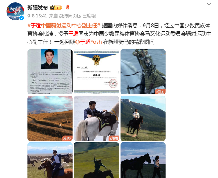 9月8日下午,据新疆发布消息,经过中国少数民族体育协会批准,于适被任命为中国骑射运动中心副主任。于适骑射相关荣誉方面:他曾在《我的阿勒泰》中任骑射指导,央视纪录片《武者归来》金代骑射射柳复原者,2021年尚武骑射积分赛亚军,2023年第三届广东省马术节全国骑射冠军杯第六,2023年第三届广东省马术节全国骑射冠军杯最佳风采运动员,2024年中华骑射大讲坛《中国金代骑射射柳技艺》主讲人。