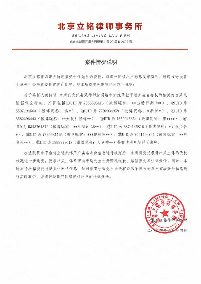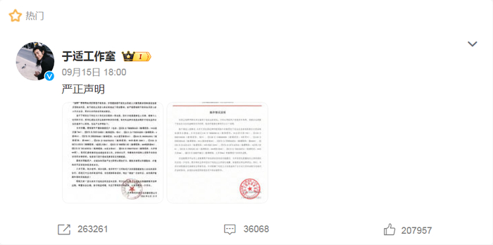 9月15日,于适工作室针对近期网络平台上的不实言论和针对其个人的侮辱性词汇等发布严正声明。声明指出,工作室已委托律师事务所介入处理。
