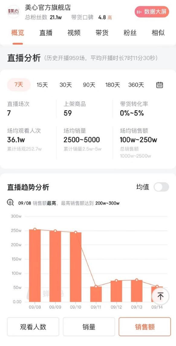 与此同时,美心月饼直播间也呈现热闹景象。第三方数据显示,某直播平台美心官方旗舰店近7天直播7次,场均观看人次36万,场均销售额100万元—250万元,总销售额1000万元—2500万元。