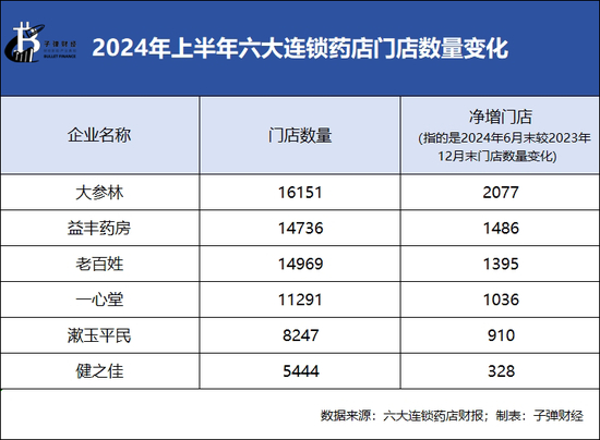 六大连锁药店中,仅有漱玉平民、健之佳线下药店数量不超过一万家,净增门店数量不超过一千家,大参林、益丰药房、一心堂、老百姓药店数量早已过万,且净增门店数量均超过千家。