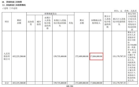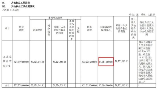 这其中,公司理财产品及结构性存款利息收入3236.4万元。另一部分投资收益则是公司持有九芝堂4271万股,获得了1708.4万元的股利收入。