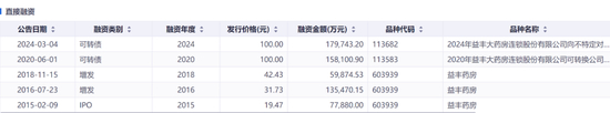 债权融资方面,2020年,益丰药业发行可转债获得15.8亿元融资。其中,12.6亿元用于新建连锁药店。今年3月,再次发行可转债获得了17.97亿元融资,公司拟用其中的12.85亿元用于新建连锁药店项目。