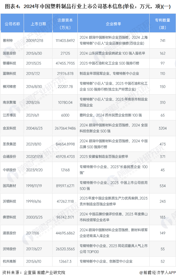 在中国塑料制品行业的上市公司中,企业规模普遍较大,注册资本几乎都在一亿元以上,这些公司主要从事新材料、精密制造、改性塑料等行业,拥有较强的专利研发能力和市场竞争力。普利特、金发科技和国风新材等企业专利数量较多,分别达741、3204和534项,显示出其在技术创新方面的强大实力。许多公司入选了各类榜单,如“胡润中国新材料企业百强榜”、“专精特新小巨人企业”、以及地方或行业百强榜,体现了它们在各自领域的领先地位。此外,这些企业的注册资本从数千万元到数亿元不等,表明了它们在市场中的不同规模和影响力。