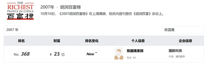 2006年,国脉科技在深交所上市,并一举摘得“中国电信外包服务第一股”桂冠。也因此,2007年,陈国鹰的名字首登《胡润百富榜》,如今,随着慧翰股份的成功上市,其身价势必将大幅增长。