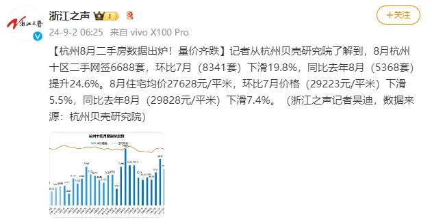 到了7月,中指数据统计显示,杭州二手房价格同比更是下跌了7.24%;进入8月,杭州贝壳研究院统计数据显示,杭州二手房价格依然继续下跌,同比去年下跌7.4%。