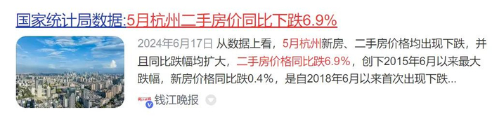 结果怎么样呢?国家统计局的数据显示,5月杭州二手房价格同比下跌6.9%;6月杭州二手房价格同比下跌6.1%。