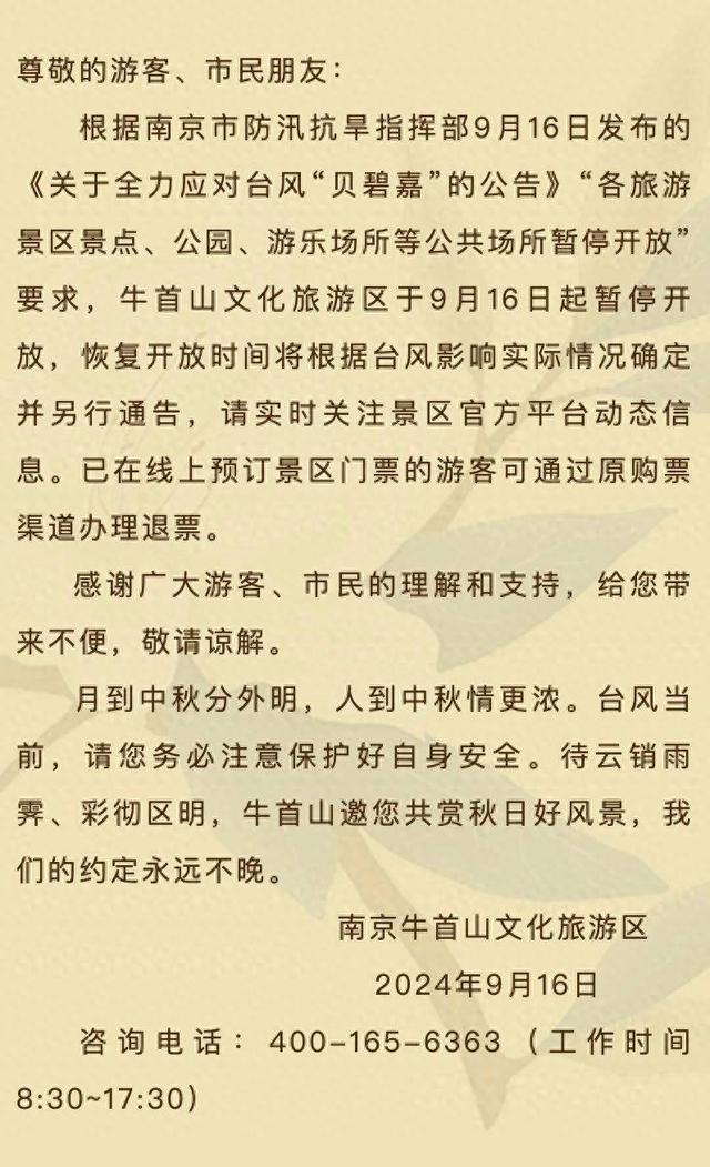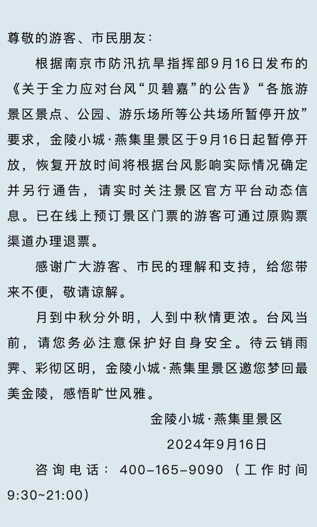 扬子晚报网 9月16日讯(记者 姜婧仪 通讯员 宁牛轩)9月16日,记者从南京牛首山文化旅游区了解到,牛首山文化旅游区、金陵小城·燕集里景区9月16日起暂停开放,恢复开放时间将根据台风影响实际情况确定并另行通告,请实时关注景区官方平台动态信息。已在线上预订景区门票的游客可通过原购票渠道办理退票。