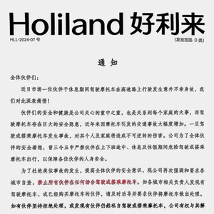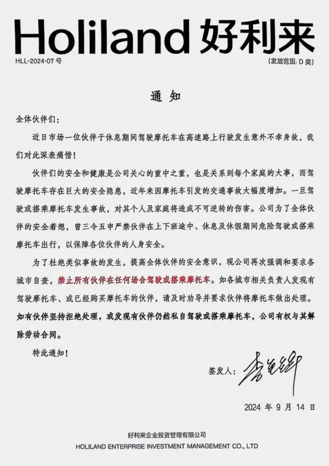 该通知显示,近日,好利来一位员工于休息期间驾驶摩托车发生意外不幸离世,好利来因此发布该通知,并称如果有员工仍私自驾驶或搭乘摩托车,公司有权与其解除劳动合同。