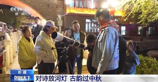 在新疆乌鲁木齐,当地举行了“送你一轮明月”中秋游园活动。夜幕降临,游客们将一盏盏色彩斑斓的河灯放入河中,表达对家人和家乡的祝福。游园会上,小朋友们还可以通过天文望远镜,“近距离”观赏月亮。