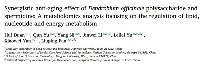 近日,江南大学的研究人员在" International Journal of Biological Macromolecules "期刊上发表了一篇题为" Synergistic anti-aging effect of Dendrobium officinale polysaccharide and spermidine:A metabolomics analysis focusing on the regulation of lipid,nucleotide and energy metabolism "的研究论文。