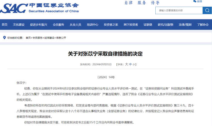 中证协表示,上述行为属于“在测试中使用手机等电子设备查阅相关内容的”严重违规情形,违反了《证券行业专业人员水平评价测试实施细则》的相关规定。考虑到吕颜辰所在机构已因此对其采取解除劳动合同的内部问责措施,根据相关规定,中证协决定对吕颜辰采取认定十二个月不适合从事相关业务(全部证券业务)的纪律处分,并按规定记入中证协执业声誉信息库和证券期货市场诚信档案数据库。