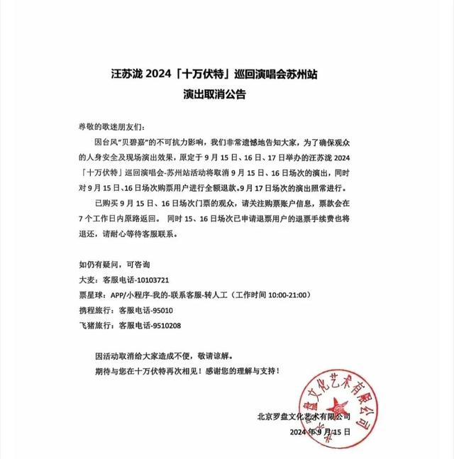 汪苏泷苏州演唱会原定于9月15日、16日、17日举办,15日、16日场次取消,17日照常演出。对购买15日、16日场次的观众全额退款;已申请退票15日、16日场次的退票手续费也将退还。