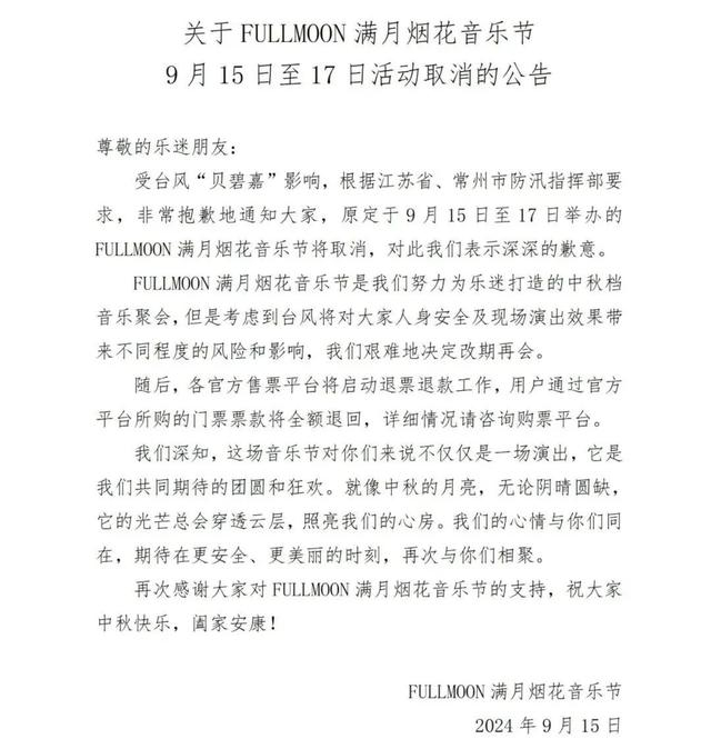 原定于9月15日至17日举办的音乐节取消。门票票款将全额退回。