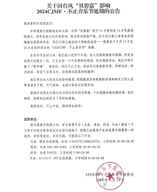 原定于9月15日至16日在杭州举办的“2024CJMF·不止音乐节”延期。退票无需操作购票订单,官方售票平台(大麦、秀动、抖音、B站)将在7个工作日内把全额票款返还至原付款账户,前期已退票并产生的退票手续费将一并退回。