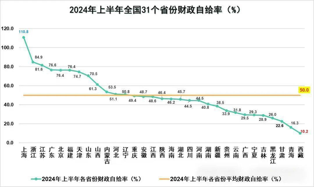 从地方来看,上半年只有上海财政自给率超过了100%,实现了盈余,其它全部入不敷出。而总共有17个省市财政自给率低于50%,最低的西藏只有10.2%,基本都要靠中央财政转移支付。而每年获得转移支付最多的河南、四川,上半年财政自给率也只有44.5%。