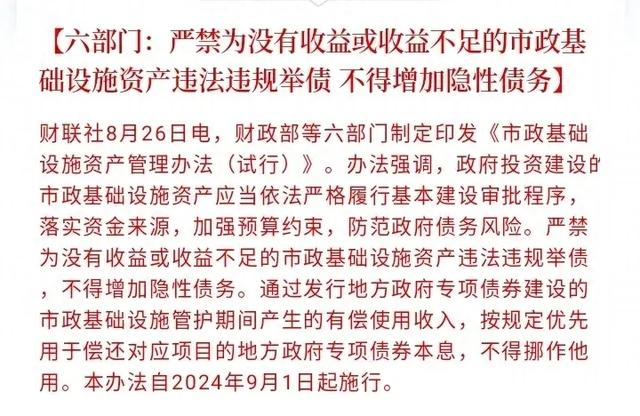 当然,更普遍的是重复建设,一条道路反复挖,不但浪费钱,还扰民。所以,财政部等六部门下发通知,严禁为没有收益或收益不足的市政基础设施资产违法违规举债,不得增加隐性债务。
