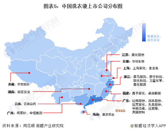 2、中国洗衣液产业链区域热力地图:河北省厂商数量分布最多,上市公司集中在南方