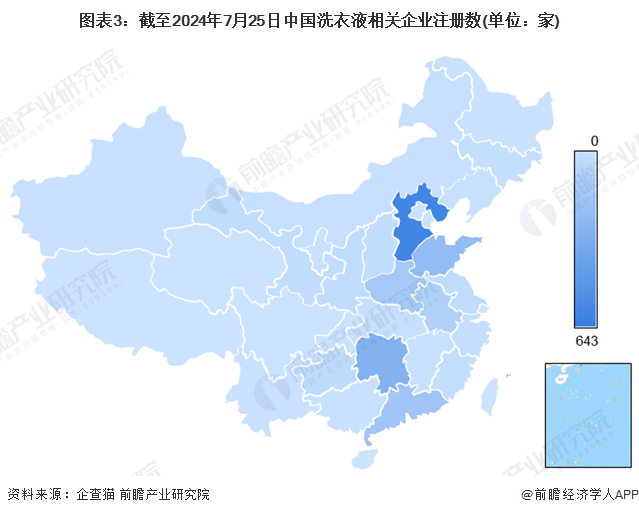 洗衣液相关企业主要集中在河北、湖南、山东和广东,因这些地区有较强的生产基础和较低的生产成本。然而,上市企业主要集中在广东和浙江,反映出这些地区有更成熟的资本市场和较高的经济发展水平,企业在技术研发、市场需求和投资环境上更具优势,因此更容易上市。这种差异表明,虽然生产企业广泛分布于多地,但资本集中和上市企业的分布更倾向于经济发达和投资环境优越的地区。