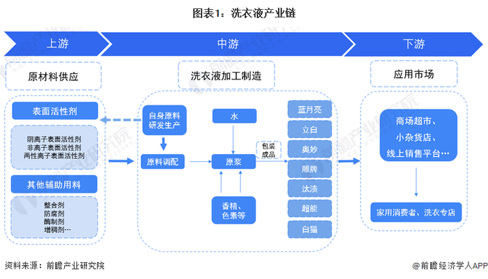 1、洗衣液产业链全景梳理:中游是洗衣液产业链的关键,且向上游延伸