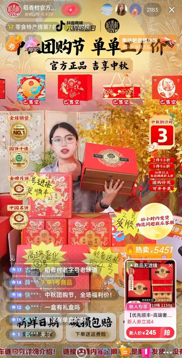 记者在苏州稻香村抖音官方直播间里看到,很多抢到联名款的网友纷纷在评论区晒单,点赞的同时表示不舍得吃下如此精美的月饼,没抢到的则纷纷“求补货”。苏州稻香村电商相关负责人介绍,在预售阶段,来自抖音电商等线上店铺、经销商的预售订单就已经让工厂加班加点都忙不过来了。现在,这款礼盒在抖音电商最为抢手,销量占总体的60%。