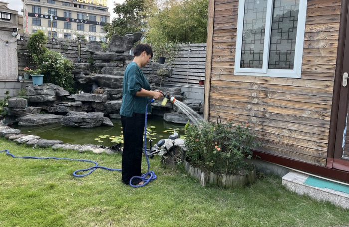 在东阳横店镇戏里戏外美宿,民宿经营者李咏梅正给庭院里给植物浇水,在她的细心装点下,小院绿意盎然,生机勃勃。“中秋假期,我们要以最好的面貌来迎接客人。”李咏梅说。
