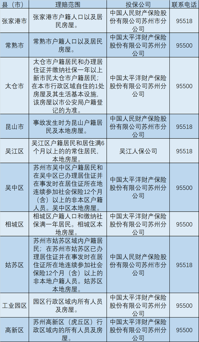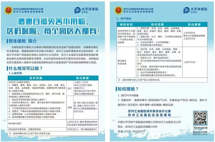 苏州工业园区应急管理局受园区管委会委托实施保险保障专项管理,为全区居民投保自然灾害民生综合保险。