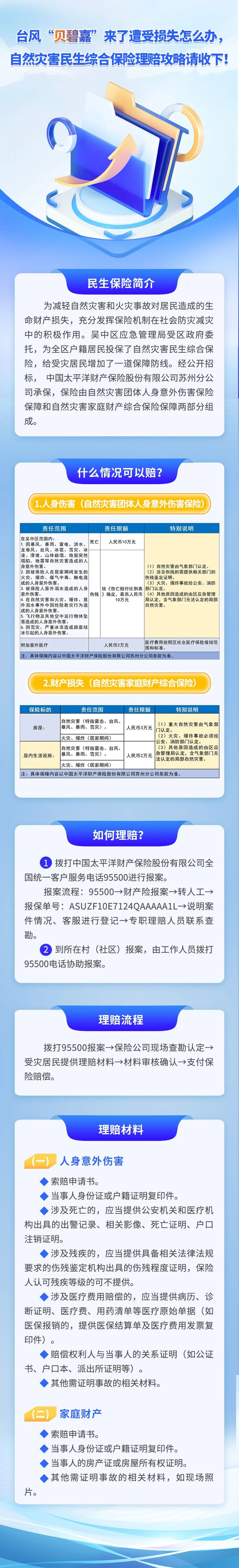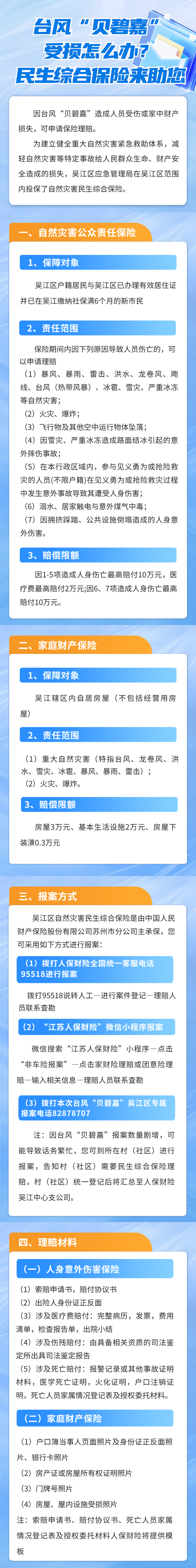 今天(9月17日),吴江区、吴中区、相城区也分别发布相关信息,提醒市民因台风“贝碧嘉”造成人员受伤或家中财产损失,也可申请保险理赔。