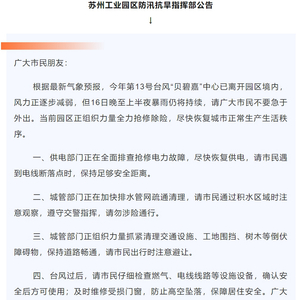 在苏州工业园区防汛抗旱指挥部昨天发布的公告中,一则信息引起了大家的关注,不少网友表达了羡慕之情: