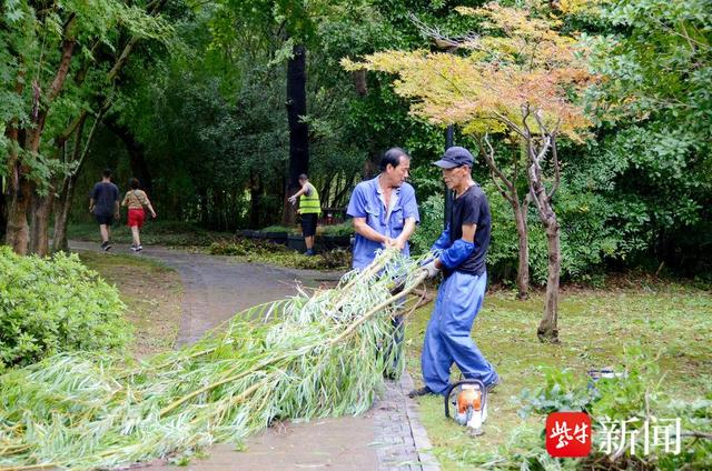17日上午11点左右,金山公园副主任徐丹霞在朋友圈晒出了一组照片“台风过后的金山”,照片中,工作人员忙着整理倒伏树木;另一边的景区主干道上,游客满脸笑容地走进景区。