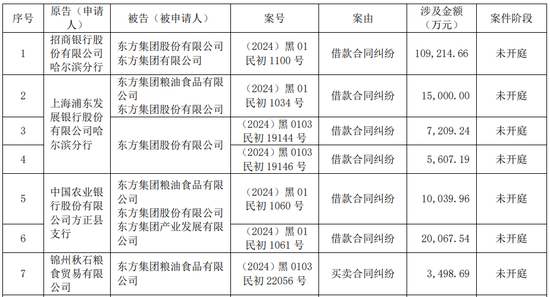 截至目前,包括招行哈尔滨分行在内,东方集团在最近12个月内,已被多家“债主”起诉或提起仲裁,其中单笔500万元以上的涉诉金额合计约17.4亿元,这些“债主”包括上海浦东发展银行股份有限公司哈尔滨分行、中国农业银行股份有限公司方正县支行、锦州秋石粮食贸易有限公司、新疆国际经济合作(集团)有限责任公司等。