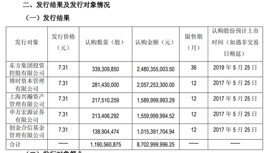 最终,上述定增计划实现募集资金净额约86.1亿元,除了张宏伟的“东方系”公司,投资方还包括博时资本管理有限公司、上海兴瀚资产管理有限公司、申万宏源证券有限公司和创金合信基金管理有限公司。