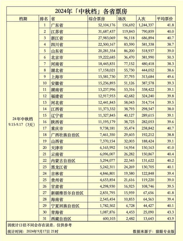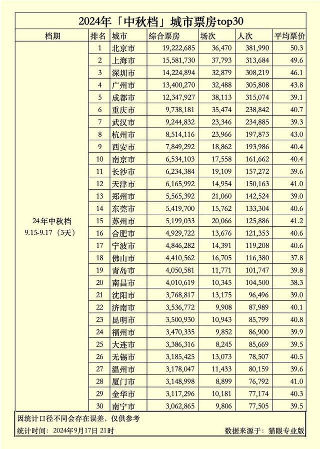 今年中秋档票房中,四川省以超2250万的综合票房位列各省票房第四,成都市以超1234万的综合票房位列城市票房第五位。