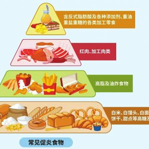 美国科学家在2014年发表了一份膳食炎症指数(DII),对饮食的抗炎作用与促炎作用进行量化评分。一般“促炎饮食”多为甜食、高脂食物、油炸食物、精致碳水食物、加工肉类等,而“抗炎饮食”多为新鲜果蔬、杂粮杂豆、坚果、水产品、香辛料等,抗炎因素主要包括维生素(A、C、E等)、植物抗氧化物(花青素、番茄红素、类黄酮、β胡萝卜素等)、多不饱和脂肪酸(特别是欧米伽3系列)、关键微量元素(锌和硒)。