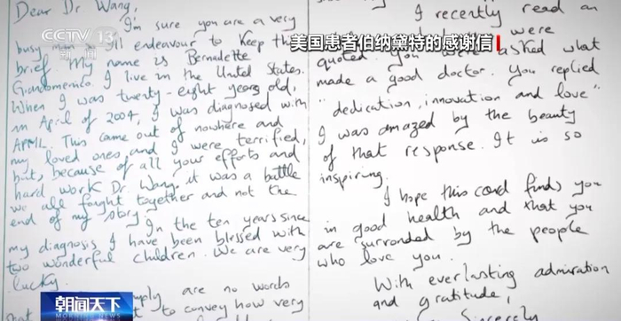 2015年,王振义收到一封从美国辗转寄来的信。美国患者伯纳黛特在信中写道:“由于您的努力和付出,我的生命得以延续。而且我现在还有了两个孩子,特地写信感谢您的付出和贡献,我想即使对您说一百万次的感谢也仍然不足以表达我的谢意。”