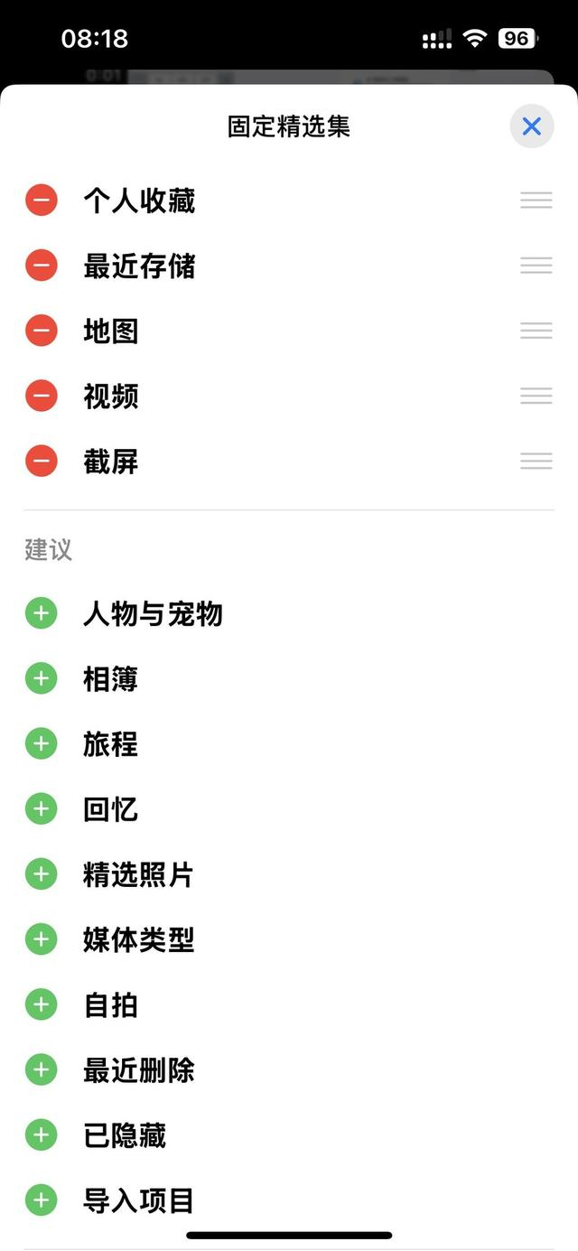 首先打开相册App,在底部选择“自定义与重新排序”,然后保留固定精选集、媒体类型、相簿、更多项目四个选项,最后在固定精选集中选择个人收藏、截图、最近删除等常用项。