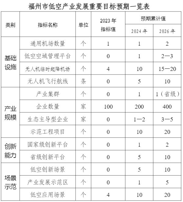 立足建设两岸融合发展示范区、福州都市圈等国家重大区域战略,完整、准确、全面贯彻新发展理念,全方位推进福州市低空产业发展。2024年底,在全省率先开展低空空域管理改革试点,经军方同意,由地方政府发布无人机适飞空域,建设军、地、民低空空域协同管理机制,布局低空全产业链。2025年底,布局无人机飞行服务站、临时起降点,打造低空产业创新平台,全市低空产业链能级跃升,技术创新能力明显增强,形成低空经济战略性新兴产业集群,争创民用无人驾驶航空器试验基地。2026年底,围绕打造高能级无人机产业体系,飞行服务更加优质。力争低空产业相关企业数量突破400家,组织筛选低空产业10大创新场景,争创国家低空经济示范区。