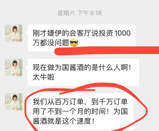 其中在广东佛山开店,标注为“为国酱酒品牌合伙人”的女士说:我是为国00后创二代,和妈妈一起做,普普通通的我们已经赚了30w,感恩遇见,感恩烨总!
