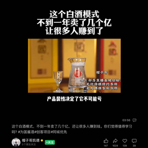 帽子哥视频的题目为《这个白酒模式,不到一年卖了几个亿,还让很多人赚到钱,你们觉得值得学习吗?》。或许正是他在视频中讲的上面这几个要点,吸引大家投身到为国酱酒的“搞钱”事业中,才成就了为国酱酒“不到一年卖了几个亿”的业绩。
